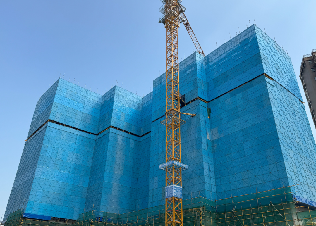 走進(jìn)施工現(xiàn)場,極目新聞記者看到,在建的5棟高層建筑外立面上采用藍(lán)色的花籃懸挑腳手架,既美觀又安全。?